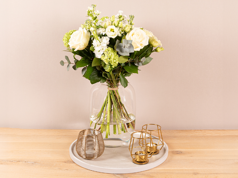 Rustig en compact wit/groen boeket, klassiek geschikt met een volle en ronde vorm.