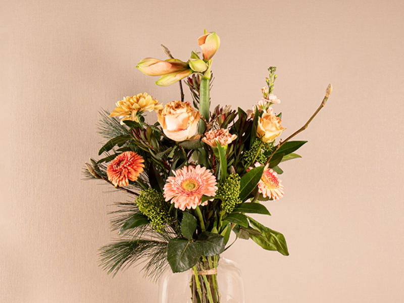 Stijlvol kerstboeket in zalm en roze tinten voor een elegante en zachte uitstraling.